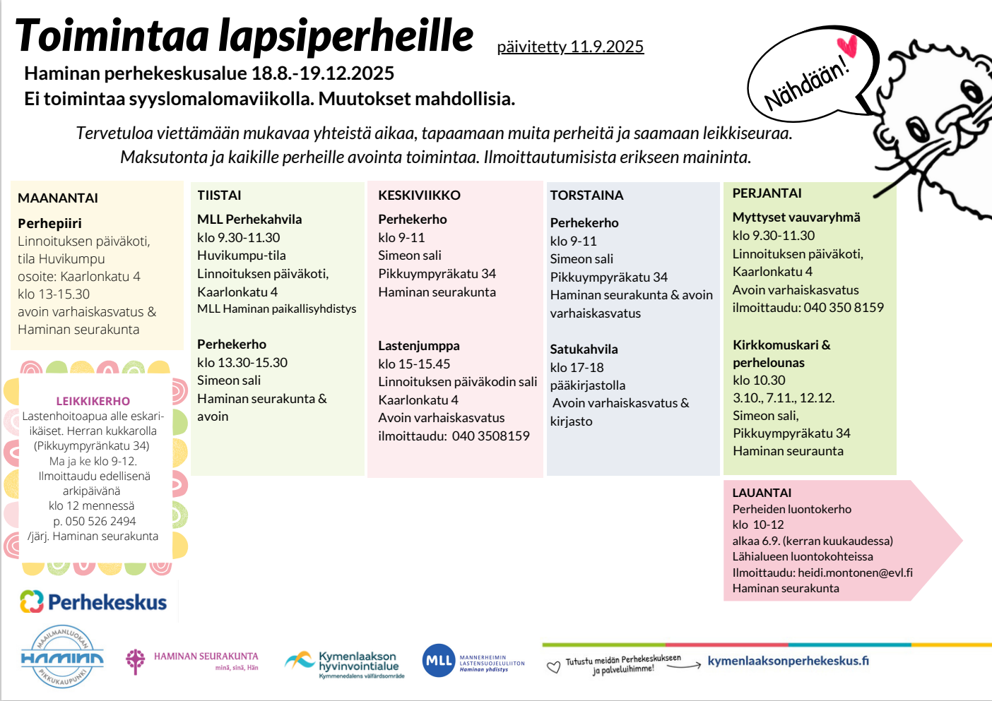 Haminan perhekeskuksen kohtaamispaikat Attachments: Hamina kohtaamispaikkalukkari 11.9.2025.pdf Tagit: Haminan kohtaamispaikat, Haminan kohtaamispaikka