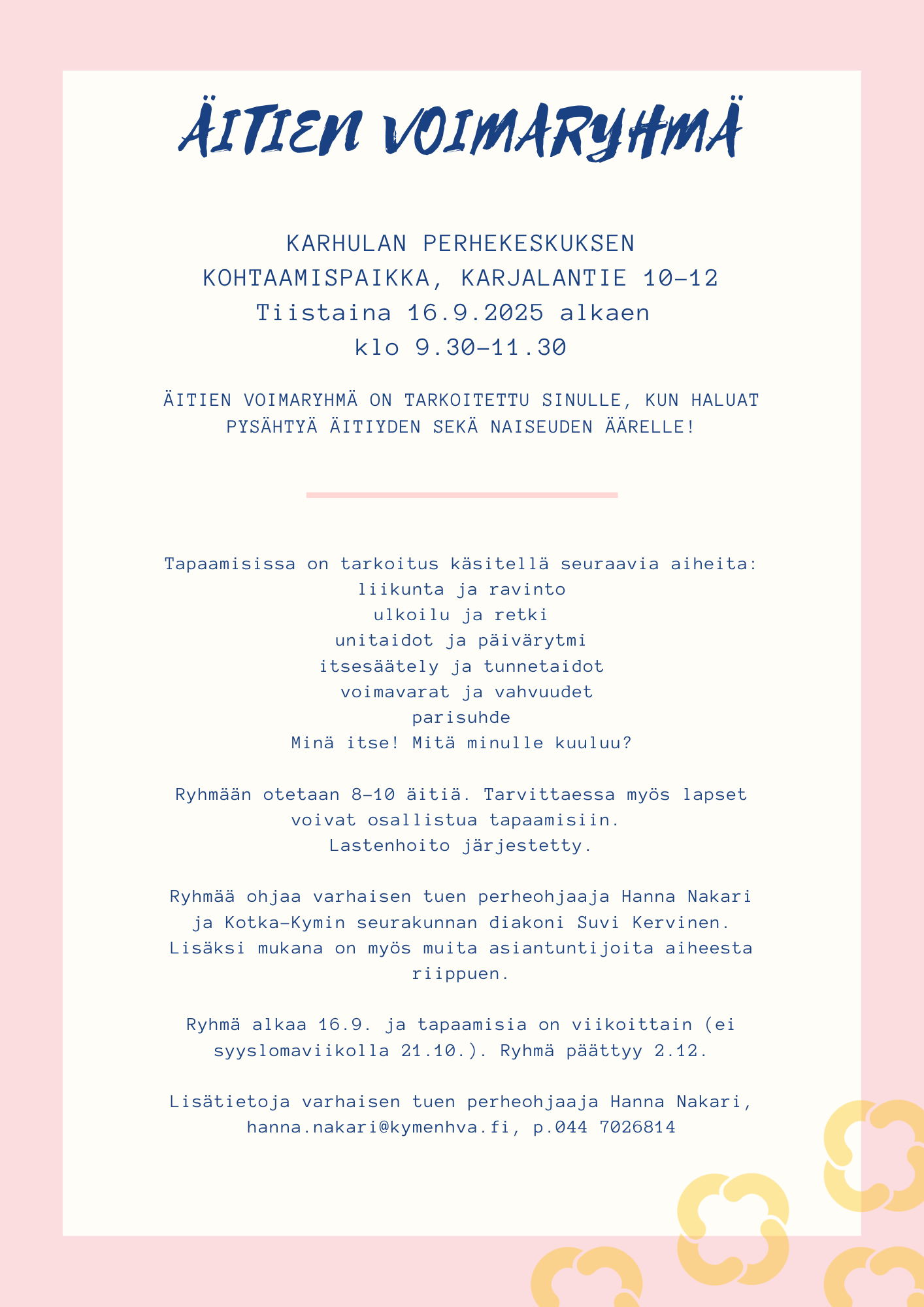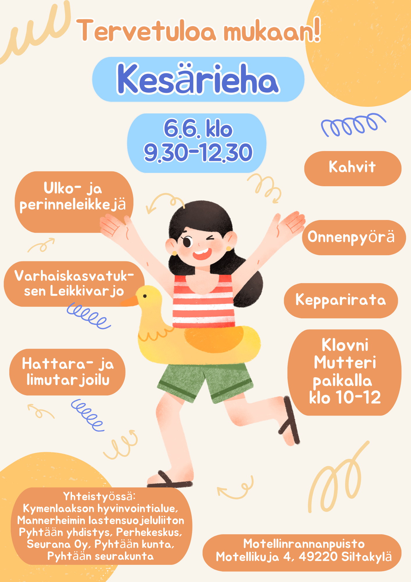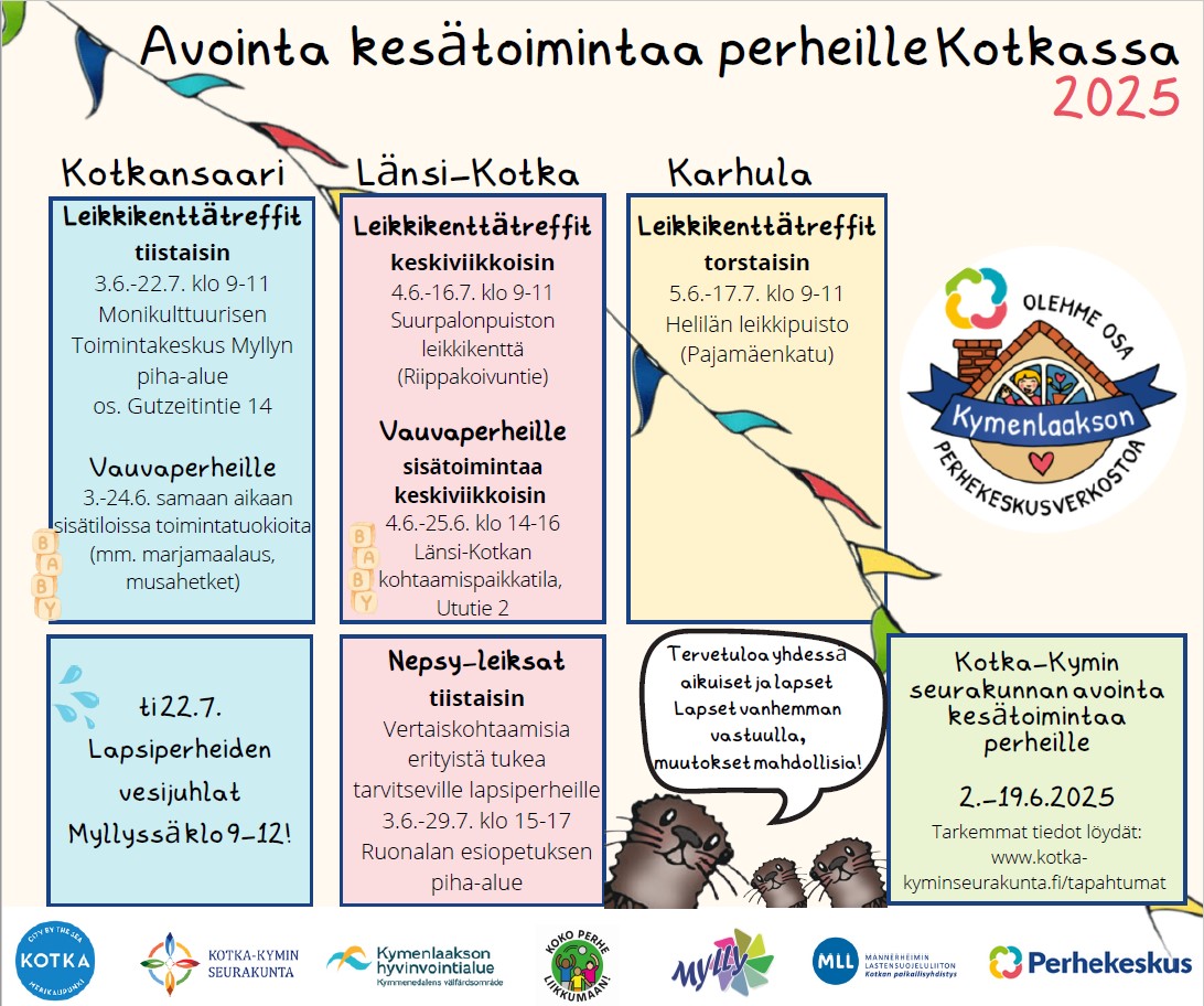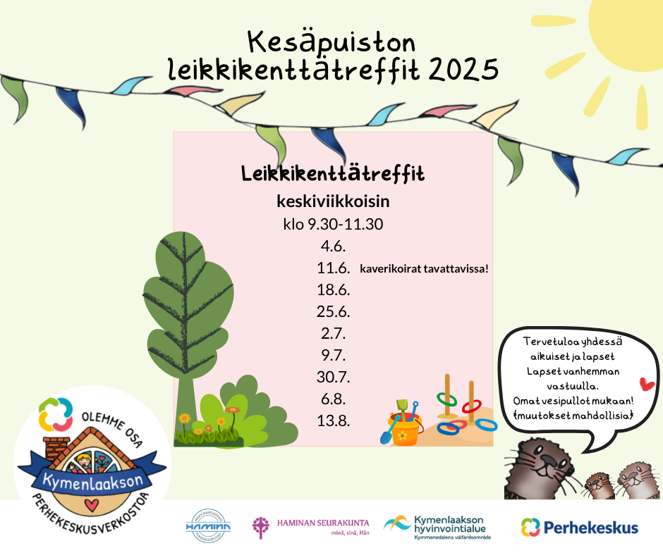 Tervetuloa Haminan Kesäpuistoon leikkikenttätreffeille kesäkeskiviikkoisin klo 9.30-11.30. Tapaamiset 4.6., 11.6., 18.6., 25.6., 2.7., 9.7., 30.7., 6.8., 13.8.2025