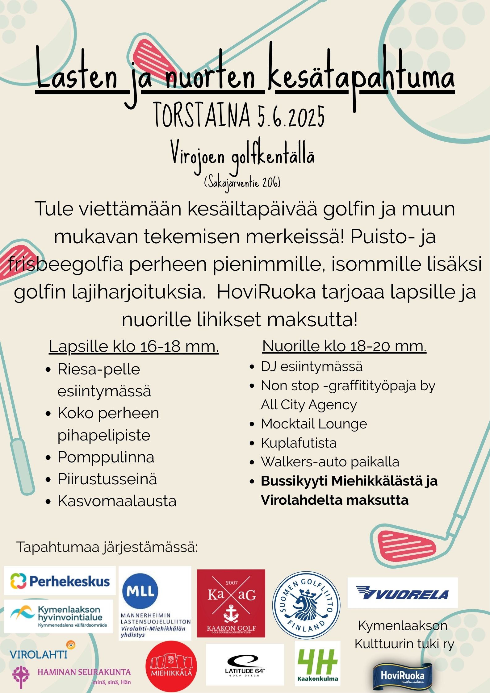 Tule viettämään kesäiltapäivää golfin ja muun mukavan tekemisen merkeissä! Puisto- ja frisbeegolfia perheen pienimmille, isommille lisäksi golfin lajiharjoituksia. HoviRuoka tarjoaa lapsille ja nuorille lihikset maksutta!