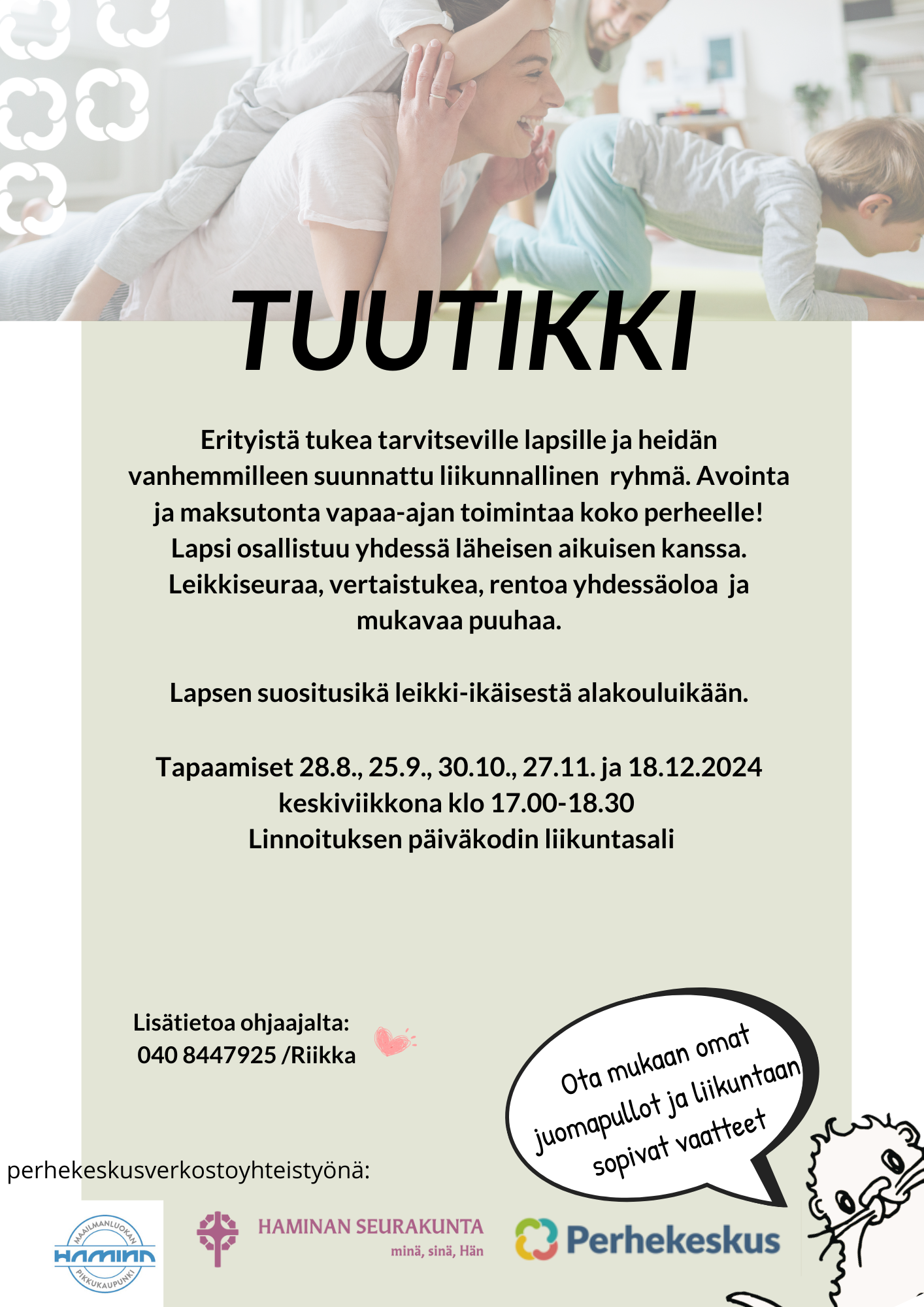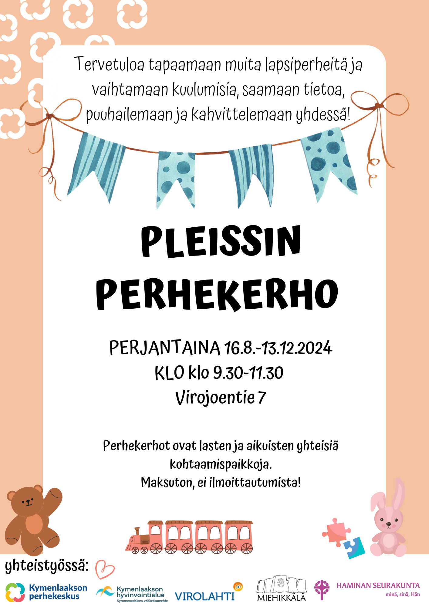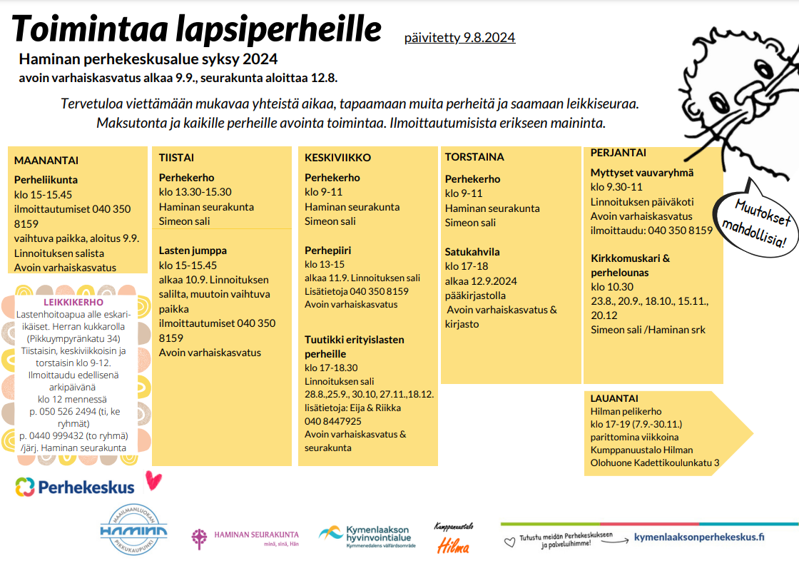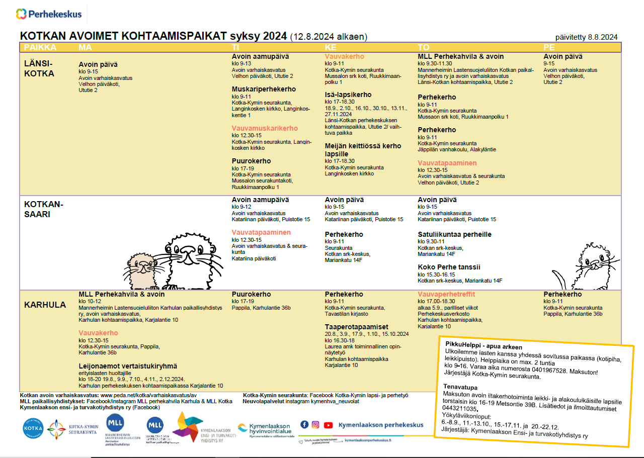 Tapaamiset järjestää Kotkan perhekeskusverkosto: Kotkan avoin varhaiskasvatus, Kotka-Kymin seurakunta, Kymenlaakson ensi- ja turvakotiyhdistys, Kymenlaakson hyvinvointialue