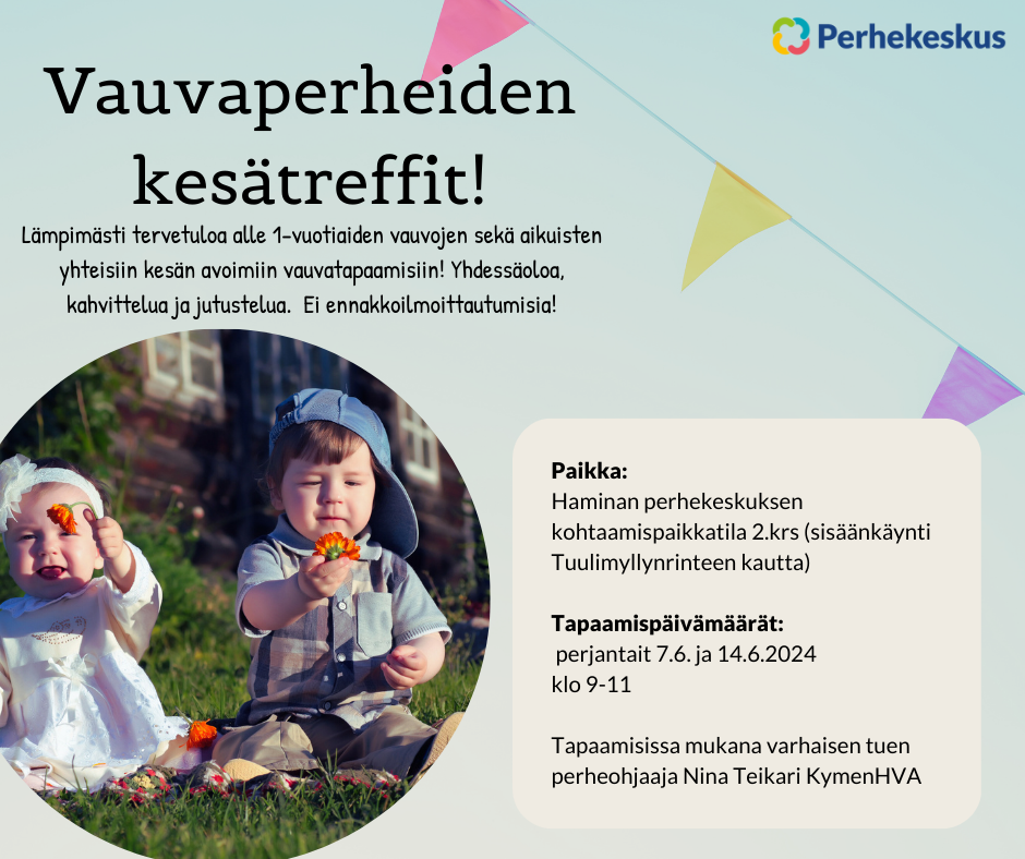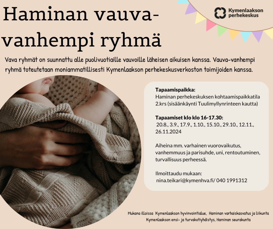 Tervetuloa vauva-vanhempi ryhmään! Vauva-vanhempi ryhmä on moniammatillisesti toteutettu ryhmä, johon voivat osallistua molemmat tai toinen vanhempi vauvan kanssa tämän synnyttyä. Vauvan ikä ryhmän alkaessa alle 6kk. Jokaiselle ryhmäkerralle on aihe, johon paneudutaan vierailijoiden toimesta tarkemmin. Teemoina mm. varhainen vuorovaikutus, liikunta, vanhemmuus ja parisuhde, uni, rentoutuminen, turvallisuus perheessä. Tarkempi sisältöjen aikataulu käydään läpi ensimmäisellä tapaamiskerralla, myös osallistujien toiveita huomioidaan! Suurimpana tavoitteena on hyväntuulinen yhdessäolo, vauvaperheasioiden jakaminen, iloitseminen vauvasta ja vanhemmuudesta sekä muihin samassa tilanteessa oleviin perheisiin tutustuminen ja mahdollisesti ystävystyminen ryhmänjäsenten kesken. Ryhmäkertoja on yhteensä kahdeksan (parillisina viikkoina) tiistaisin. Ryhmä aloittaa 20.8.2024 klo 16-17.30 Haminan perhekeskuksen kohtaamispaikkatilassa (2.krs). (Sisäänkäynti Tuulimyllynrinteen kautta) Tapaamispäivämäärät ovat: 20.8., 3.9., 17.9., 1.10., 15.10., 29.10., 12.11., 26.11.